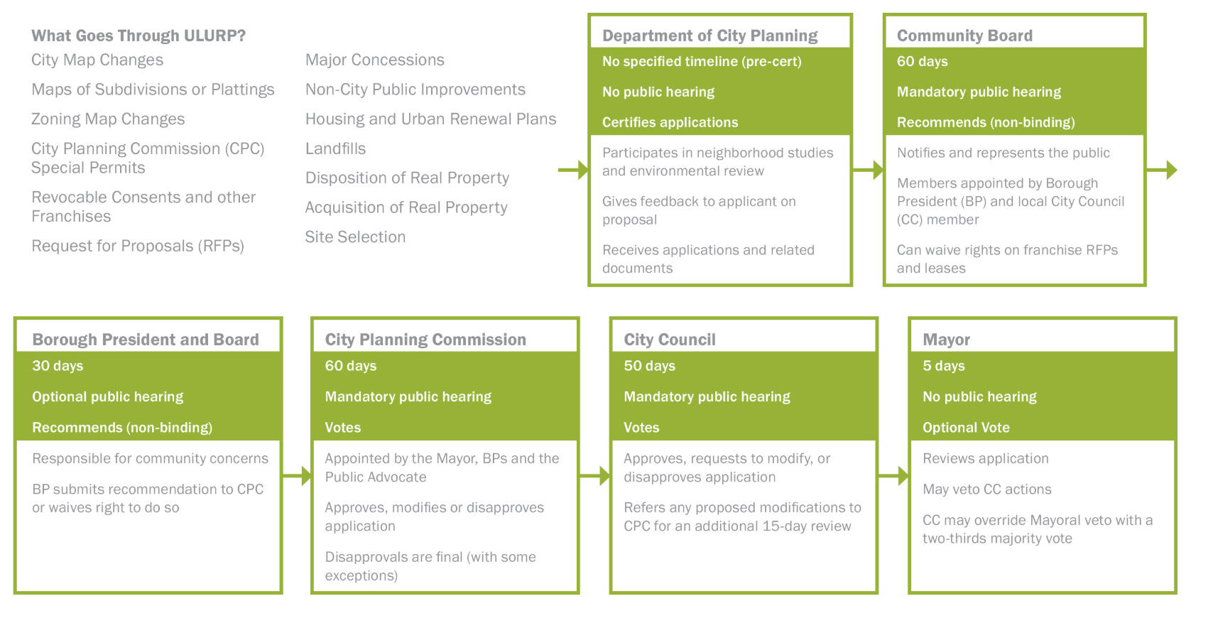 ULURP (Uniform Land Use Review Procedure) is the formal multi-step review process for any zoning change in NYC. The public review process starts with a presentation to the local Community Board.