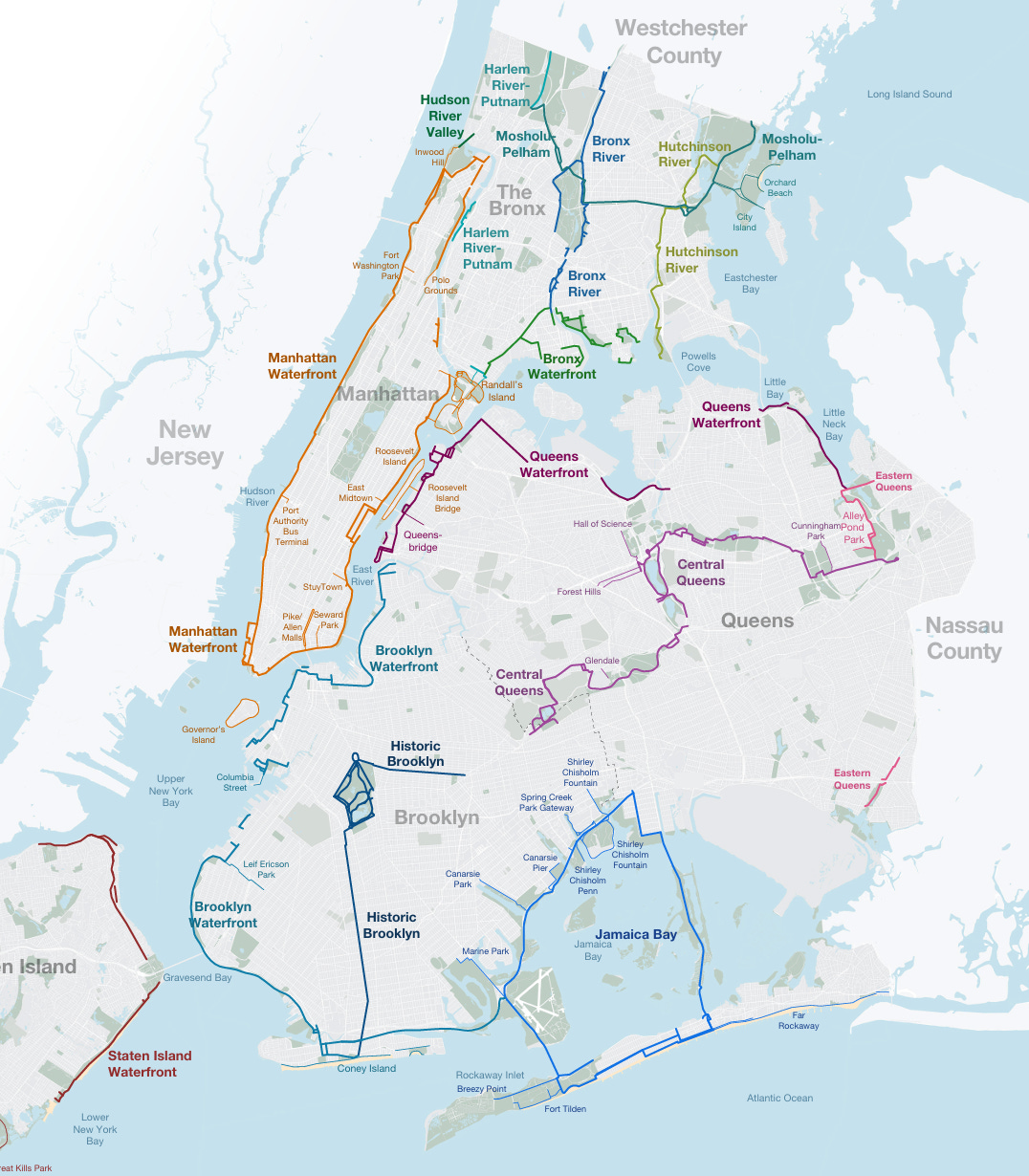 That is quite the list. It’s clear that residents, visitors, businesses, and the City itself can greatly benefit from expanding greenways in every borough. Similar to how public transit is most useful when connecting living and working hubs, greenways are most useful when connecting parks and waterfronts. The biggest issue preventing full utilization of the many miles of existing greenways is that many of them are isolated and disconnected from the larger network.