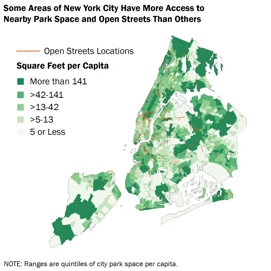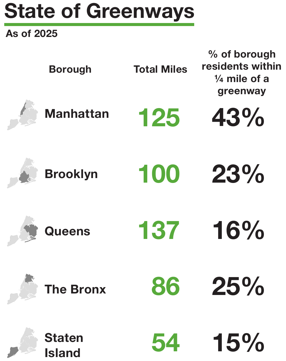 At the time of the report’s publication, the vast majority of residents did not live near a greenway, and only 17 miles of new greenway were actively under construction. Outside of Manhattan, less than a quarter of residents live within 1/4th of a mile of a greenway - making access particularly lacking in lower-income neighborhoods that would most benefit from greenway amenities.